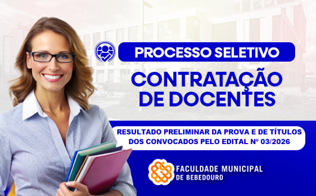 O Diretor do Instituto Municipal de Ensino Superior de Bebedouro "Victório Cardassi" (IMESB-VC), no uso das atribuições legais e regimentais, em especial o que dispõe o Edital nº 03/2026, referente ao Processo Seletivo Simplificado destinado à seleção de Professores para contratação temporária e provimento das vagas existentes nos Cursos de Graduação do Instituto, torna público, o resultado preliminar da prova didática e de títulos do certame.