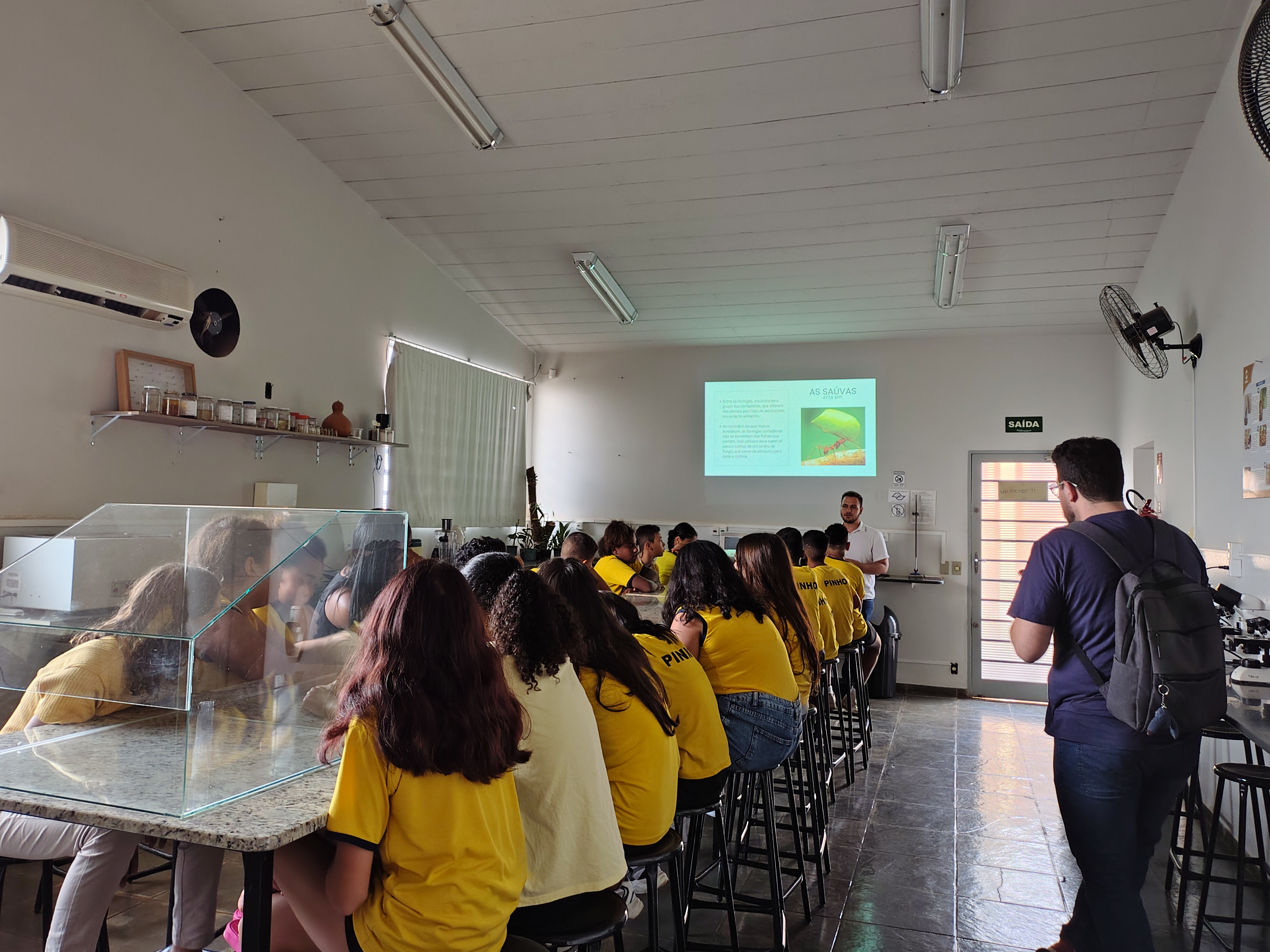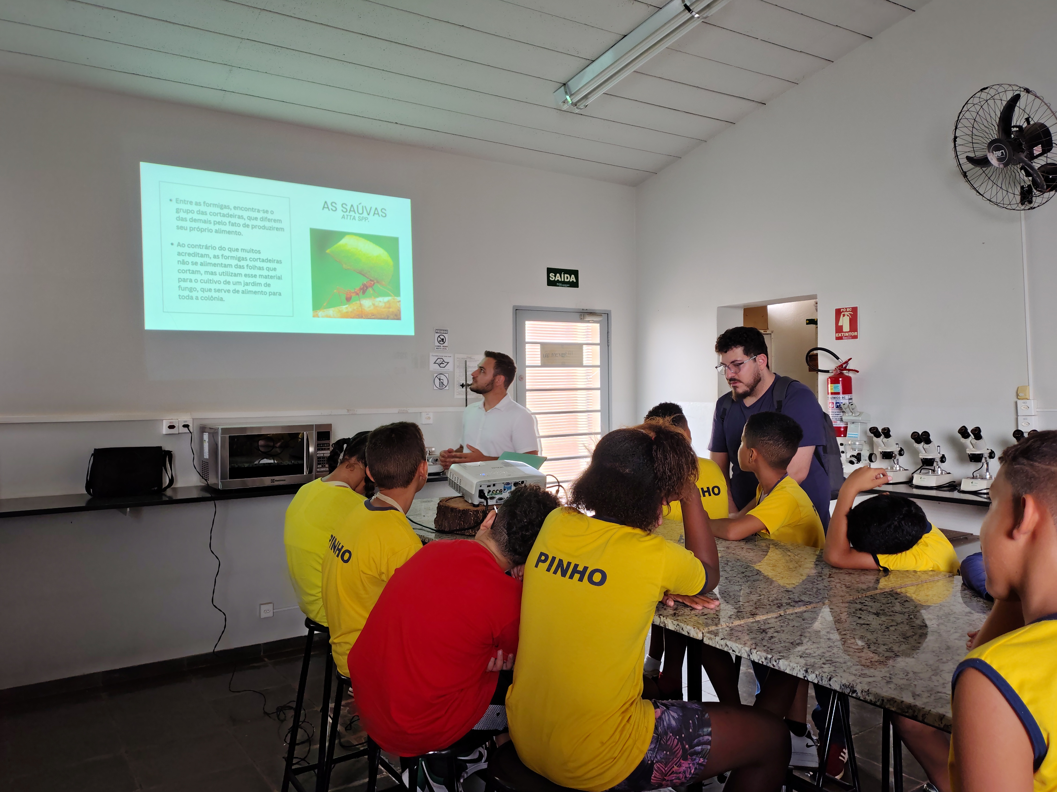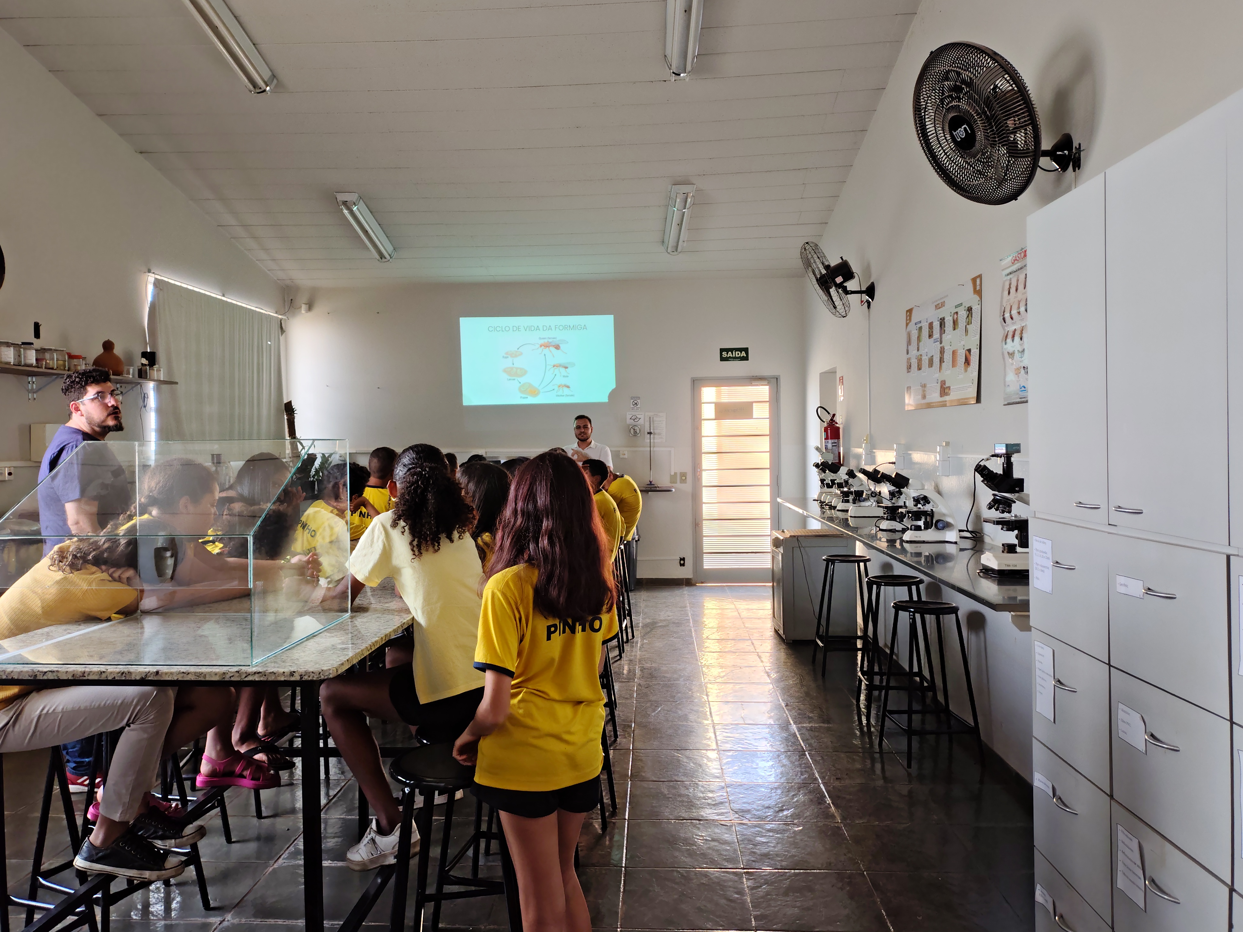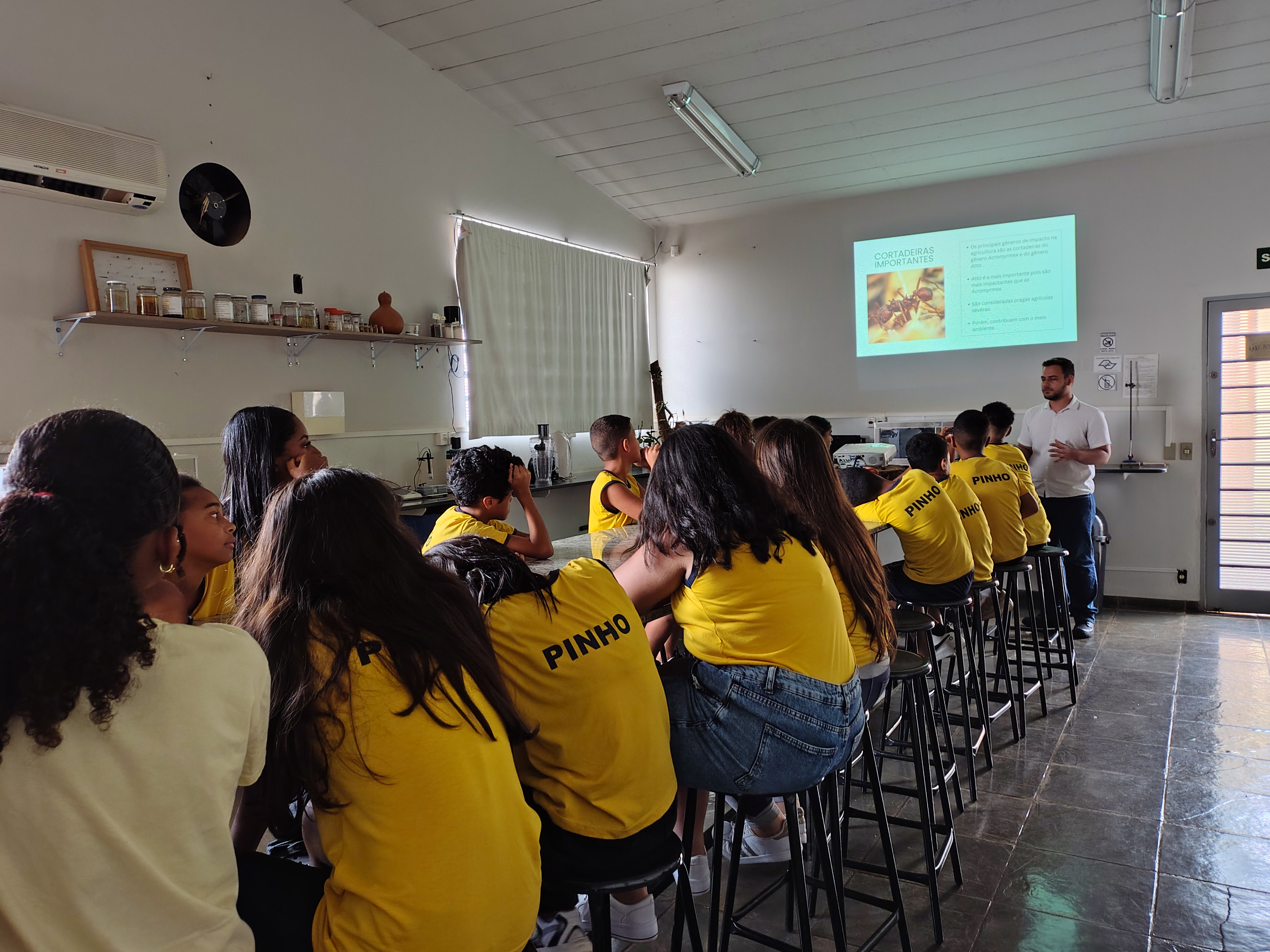 Os estudantes tiveram a oportunidade de conhecer de perto o trabalho desenvolvido no laboratório com colônias de formigas cortadeiras e aprender sobre o manejo ecológico dessa espécie, que contribui para a preservação ambiental, a proteção dos ecossistemas e a prevenção de perdas em lavouras — além de promover a conscientização desde a infância.