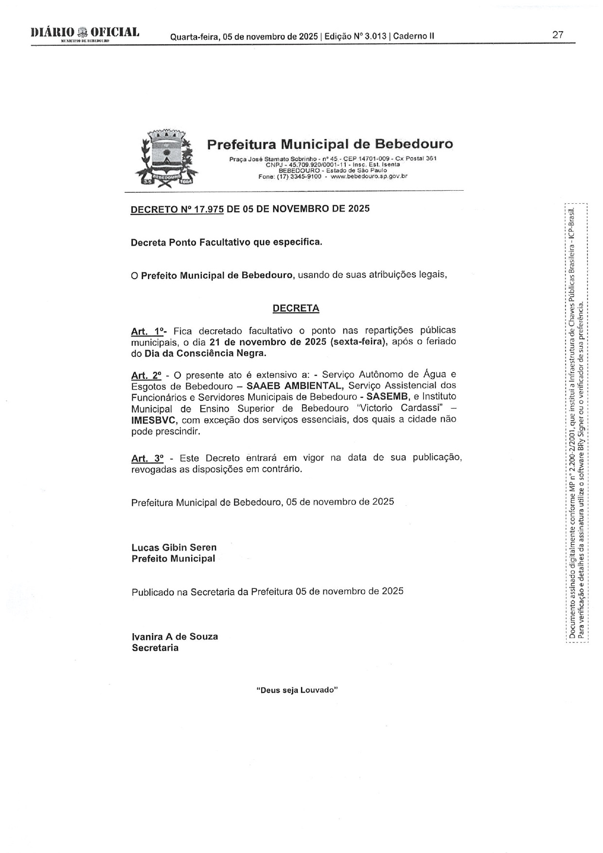 A Prefeitura Municipal de Bebedouro decretou ponto facultativo na sexta-feira, 21 de novembro, em razão do feriado nacional do Dia da Consciência Negra, celebrado na quinta-feira, 20 de novembro.