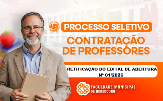 O Diretor do Instituto Municipal de Ensino Superior de Bebedouro "Victório Cardassi", no uso das atribuições que lhe são conferidas pelo Regimento Interno e atendendo as normas insertas no art. 37, IX, da Constituição Federal, nas Leis Municipais nº 2.616/97 e 5.235/2017, bem como as demais disposições legais em vigor, torna pública a retificação das exigências de Formação Acadêmica da vaga de n.º 02 , área de Engenharia Agronômica, constante do Anexo V, Edital 01/2026, as quais passam a vigorar conforme discriminado no quadro abaixo.