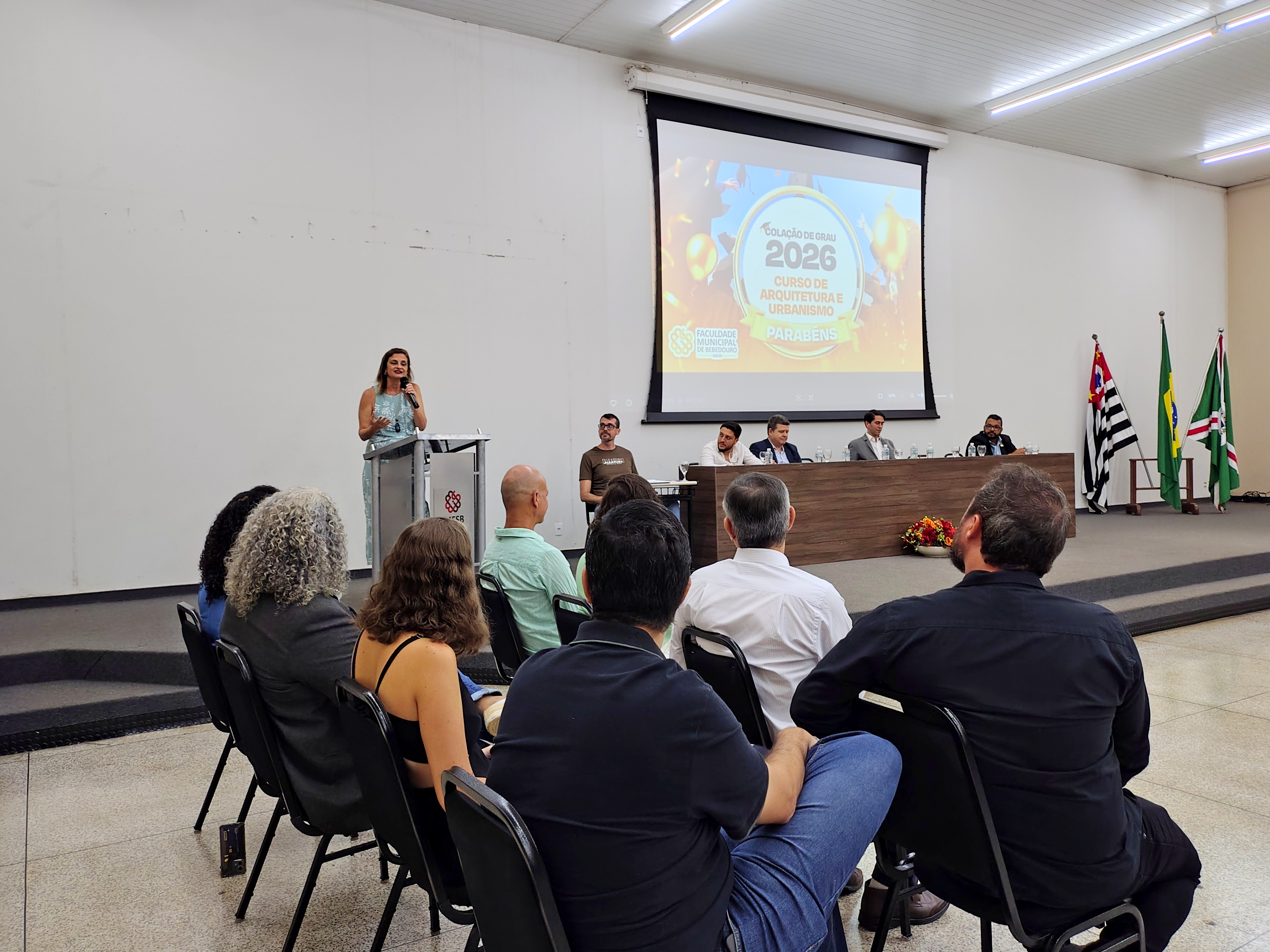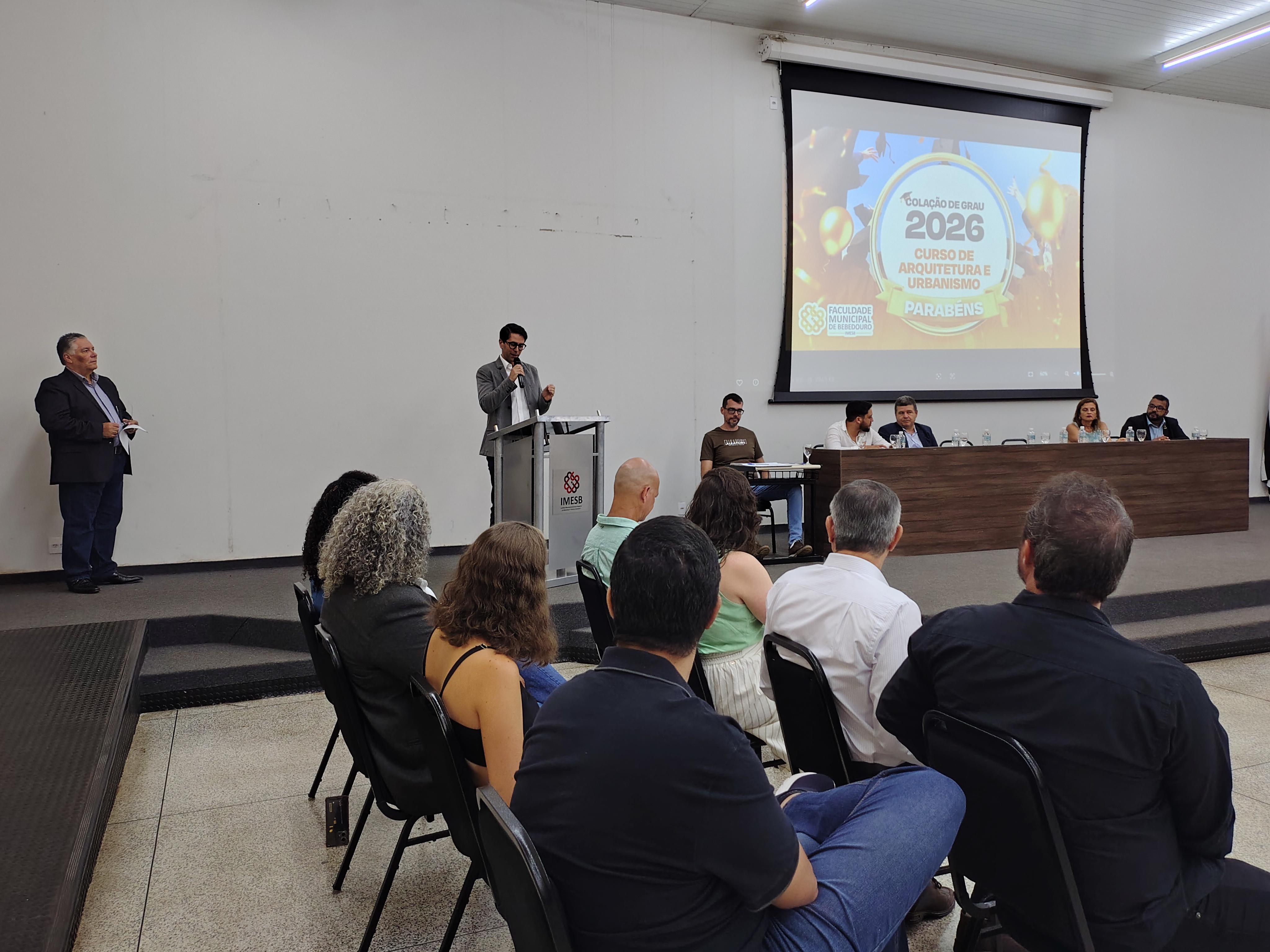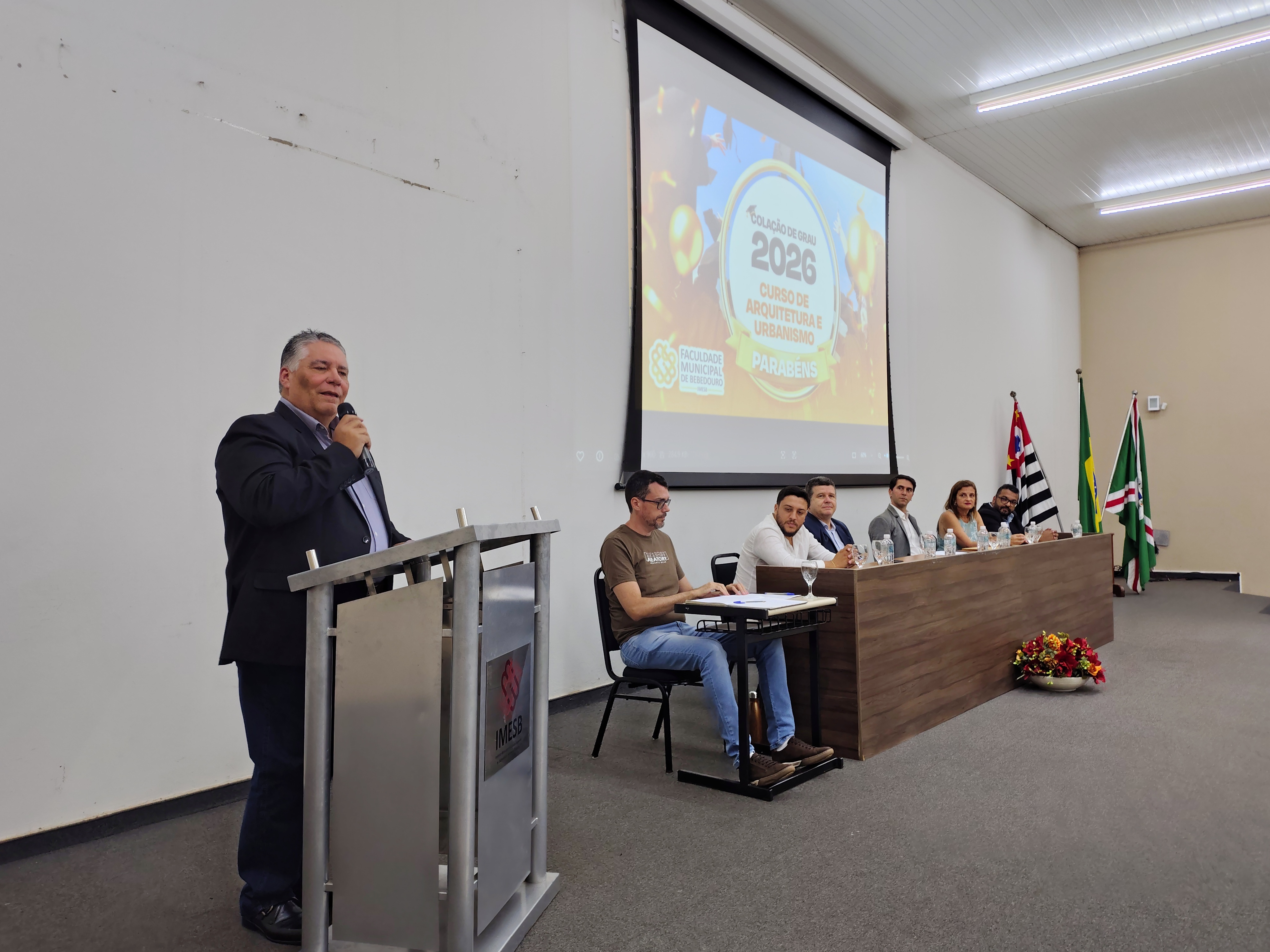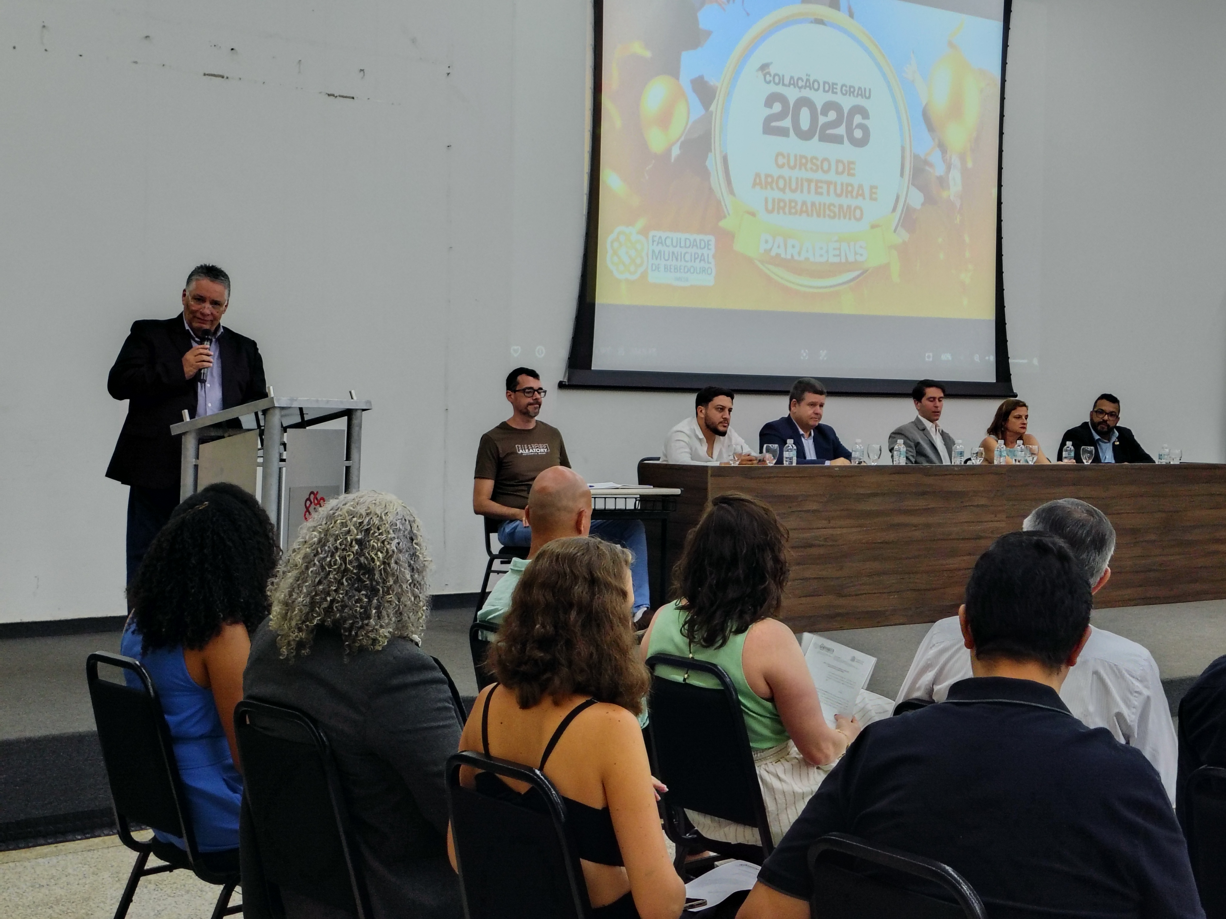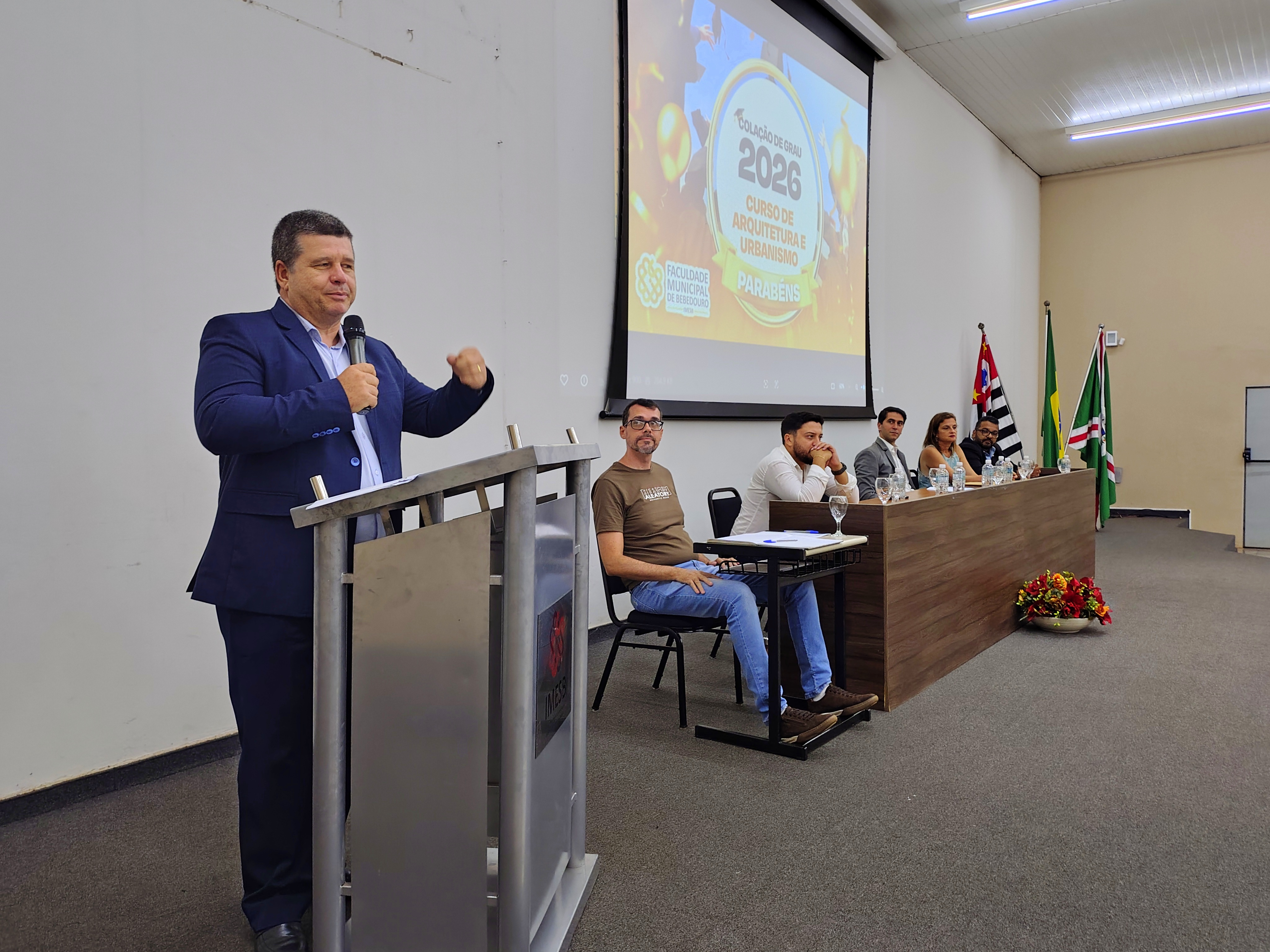 A mesa solene foi composta pelo diretor da Faculdade Municipal, Prof. Me. Luís Antônio Nogueira; pelo coordenador do curso, Prof. Dr. Clóvis Antonio Benedini Lima; pela Profa. Dra. Maria Cristina Pinheiro Machado Sanches; pelo Controlador Geral do Município e professor da instituição, Prof. Me. Marcelo Ramos, representando o prefeito municipal; o vereador Otávio Altobeli Yassine Manzi, representando a Câmara Municipal de Bebedouro; o representante do Rotary Club, Sr. Carlos Augusto de Faria e pelo secretário acadêmico da instituição Luís Fernando Andrade.