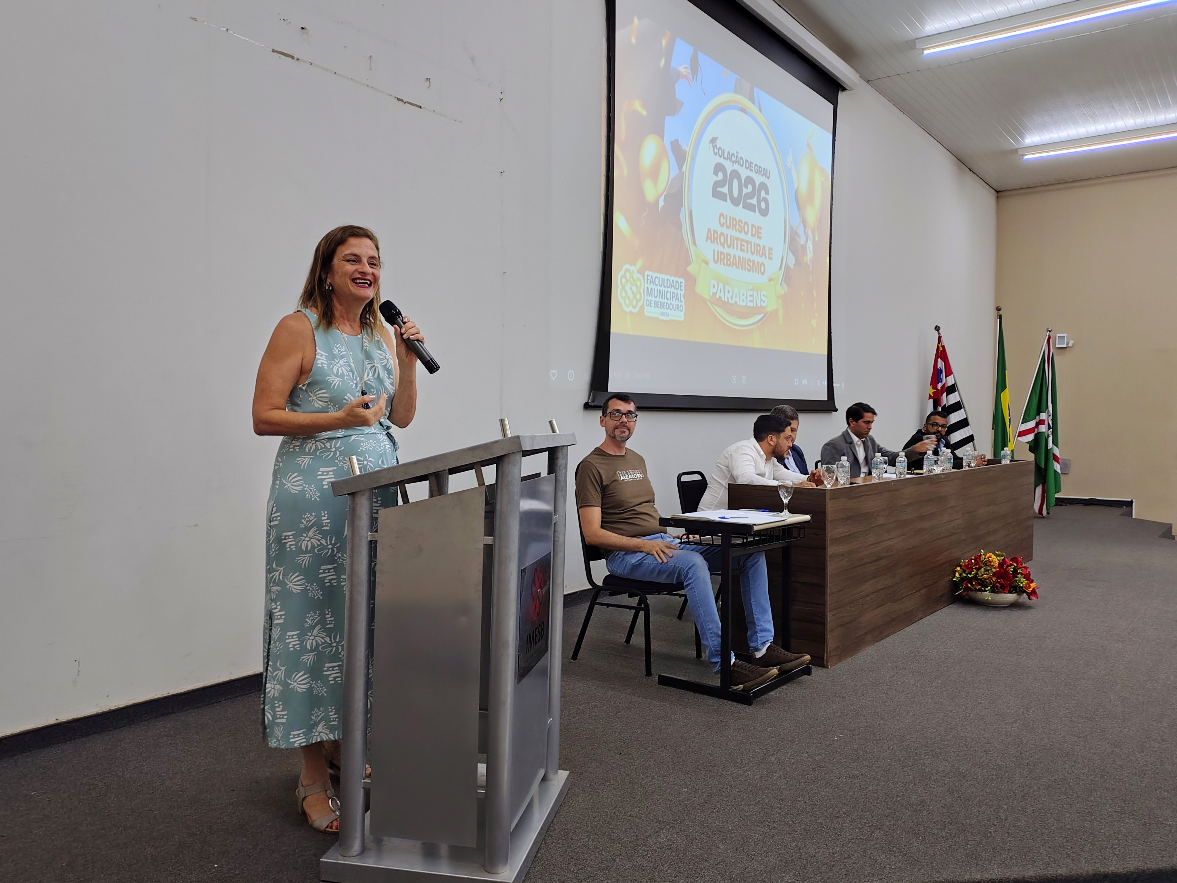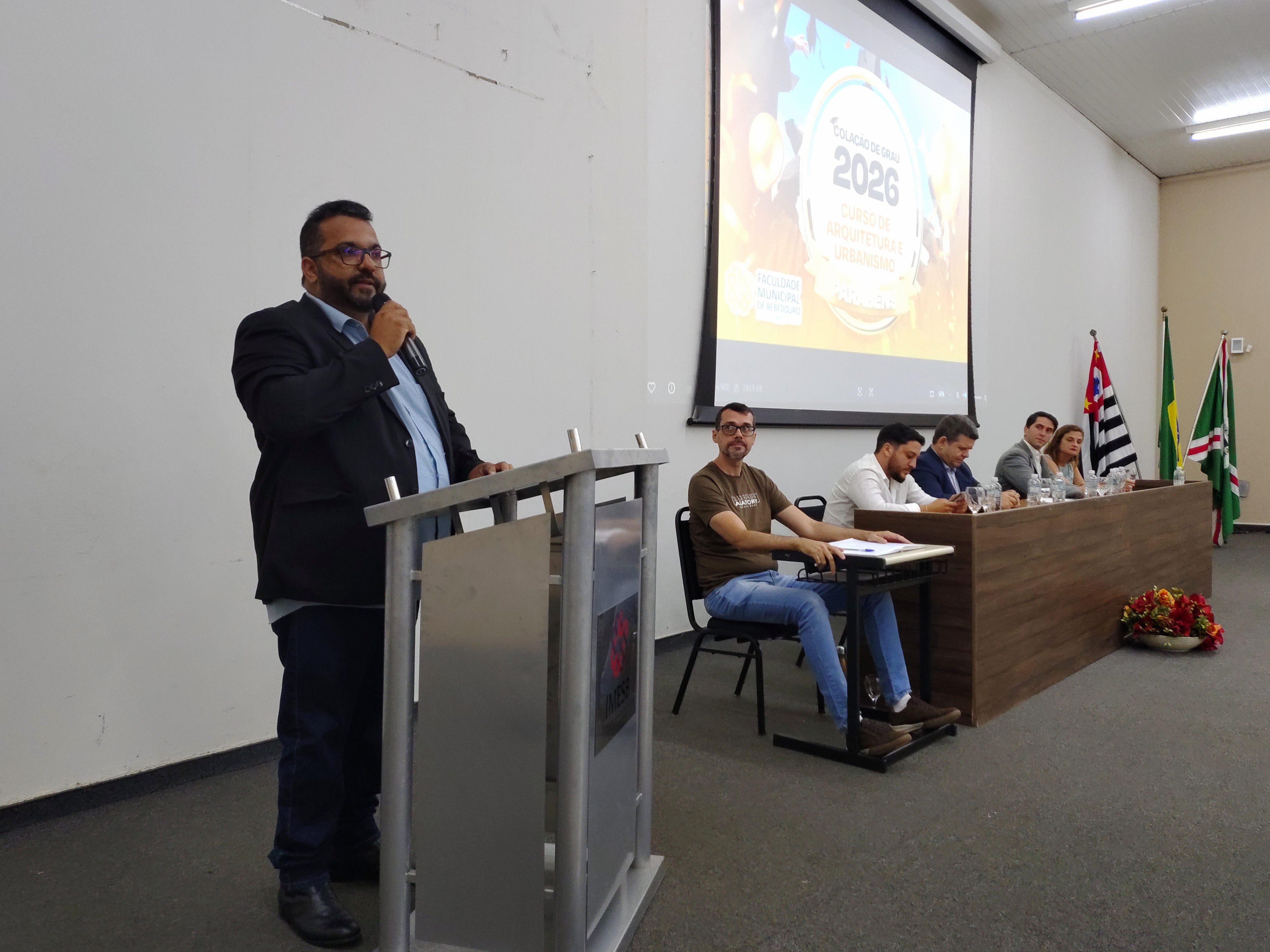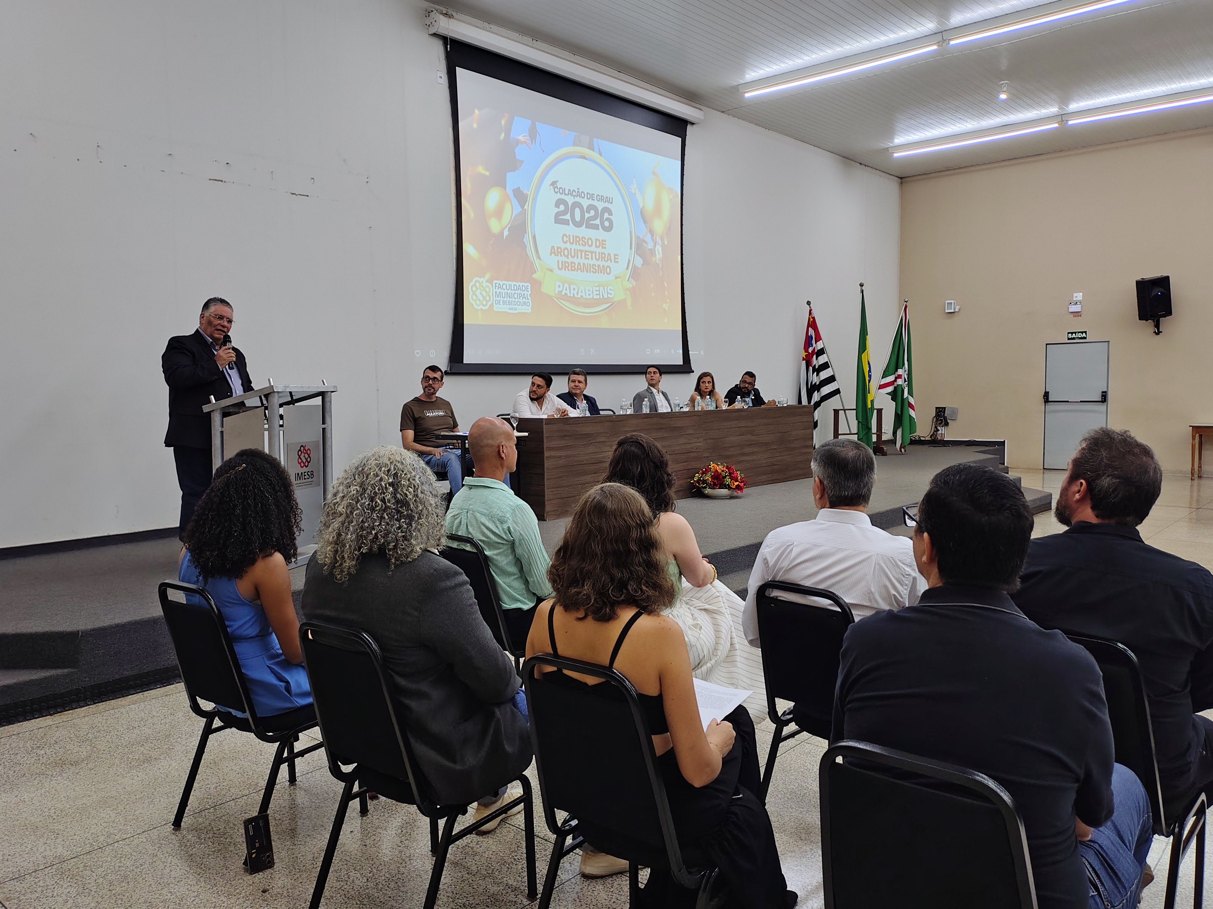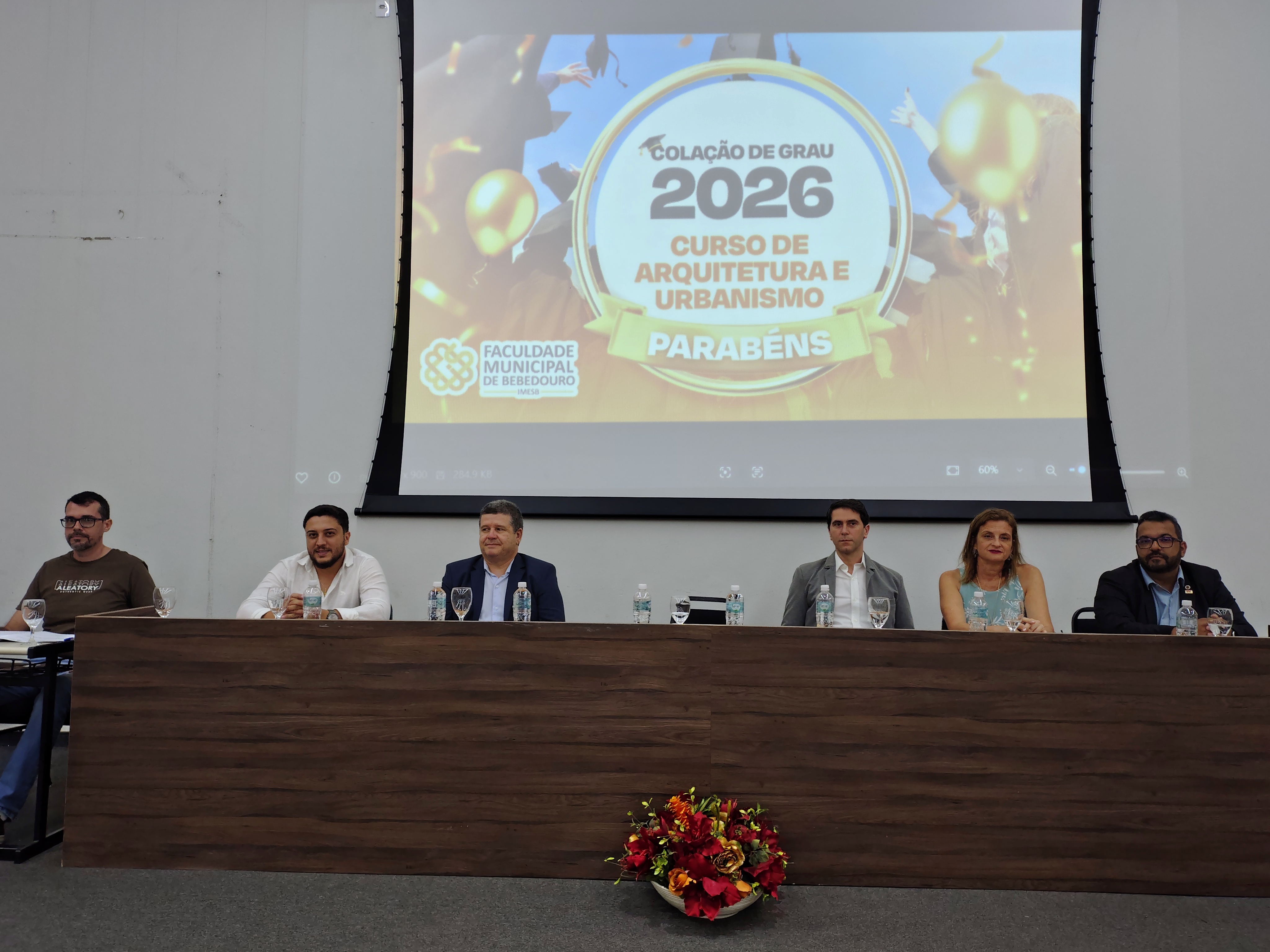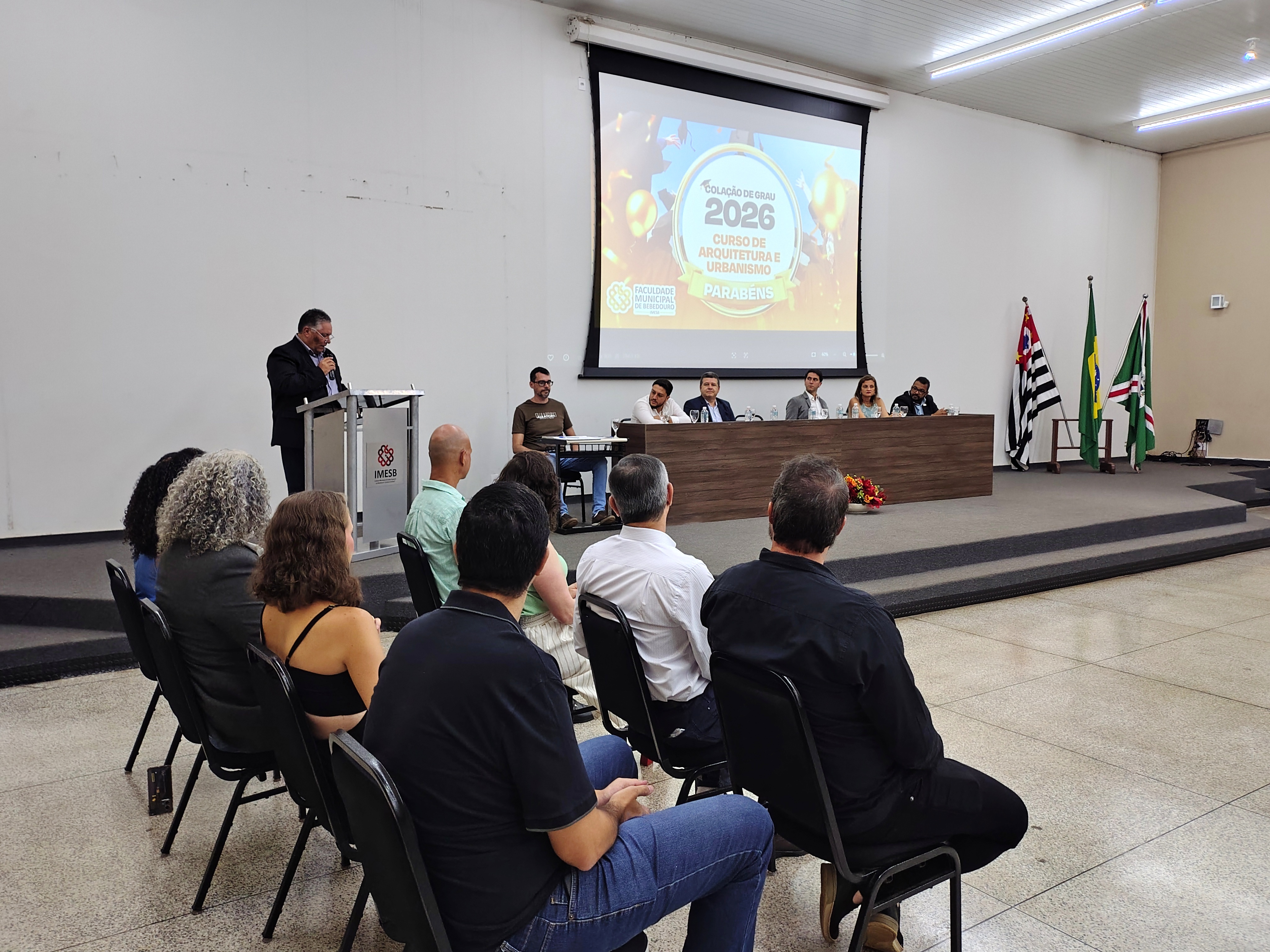 A mesa solene foi composta pelo diretor da Faculdade Municipal, Prof. Me. Luís Antônio Nogueira; pelo coordenador do curso, Prof. Dr. Clóvis Antonio Benedini Lima; pela Profa. Dra. Maria Cristina Pinheiro Machado Sanches; pelo Controlador Geral do Município e professor da instituição, Prof. Me. Marcelo Ramos, representando o prefeito municipal; o vereador Otávio Altobeli Yassine Manzi, representando a Câmara Municipal de Bebedouro; o representante do Rotary Club, Sr. Carlos Augusto de Faria e pelo secretário acadêmico da instituição Luís Fernando Andrade.