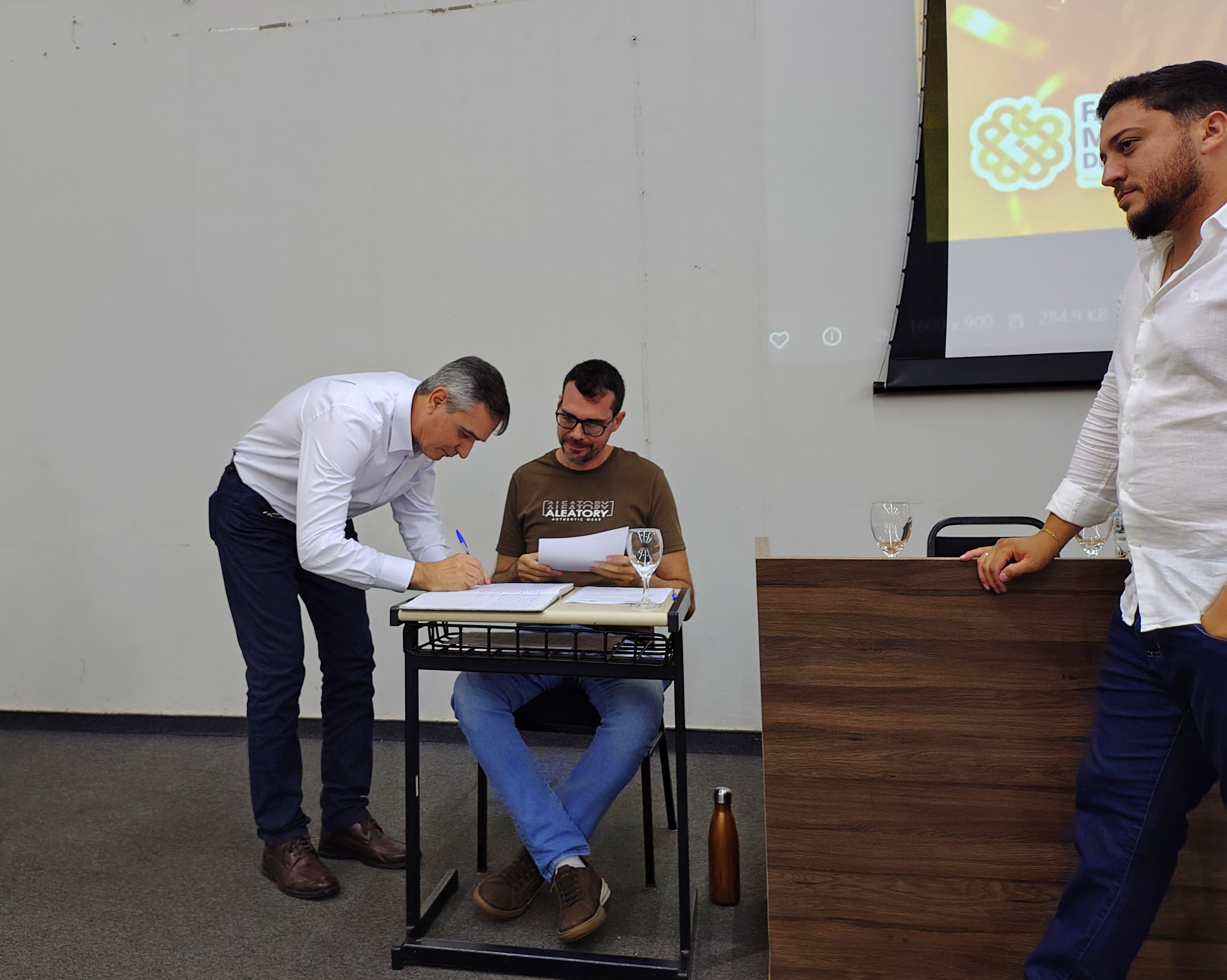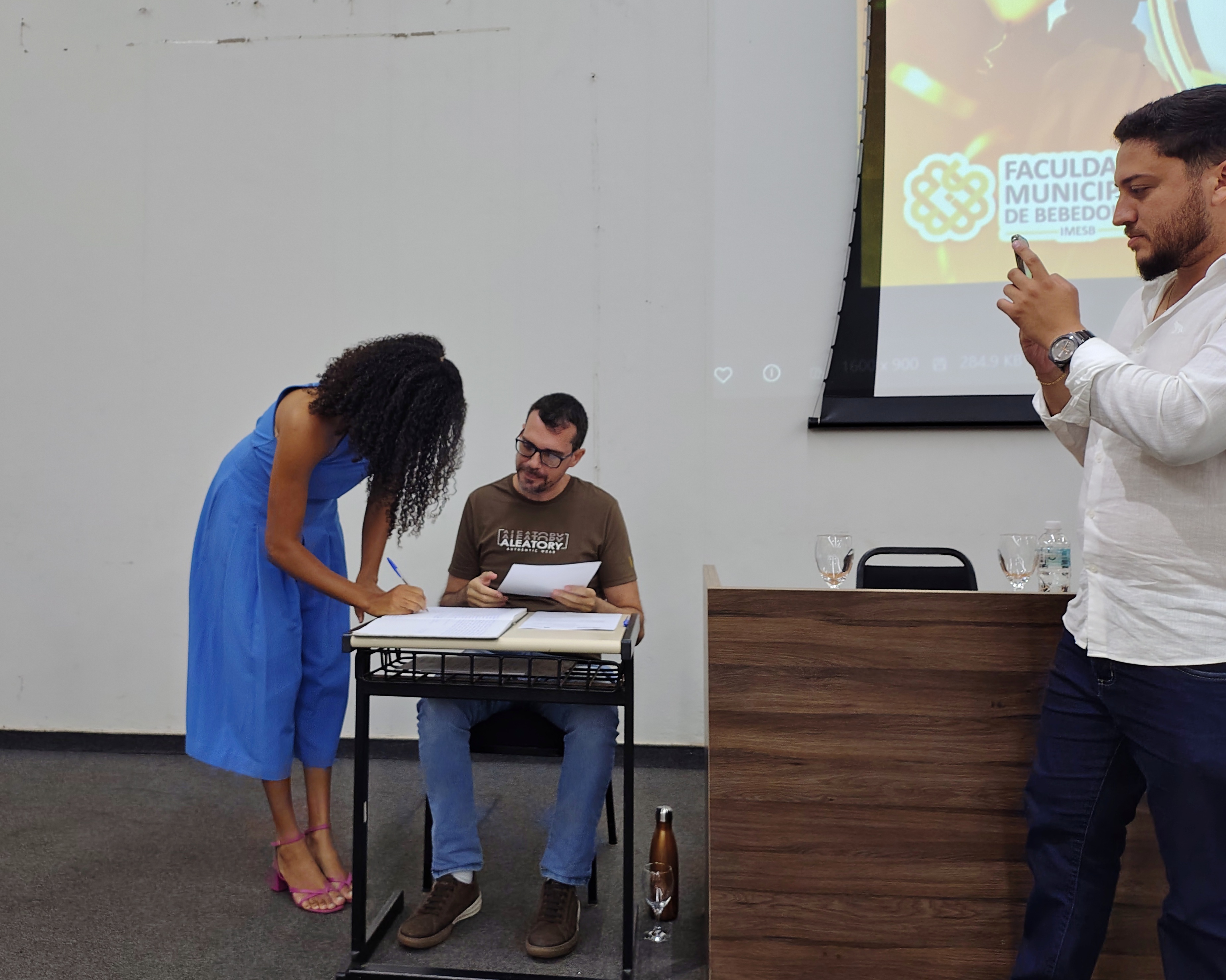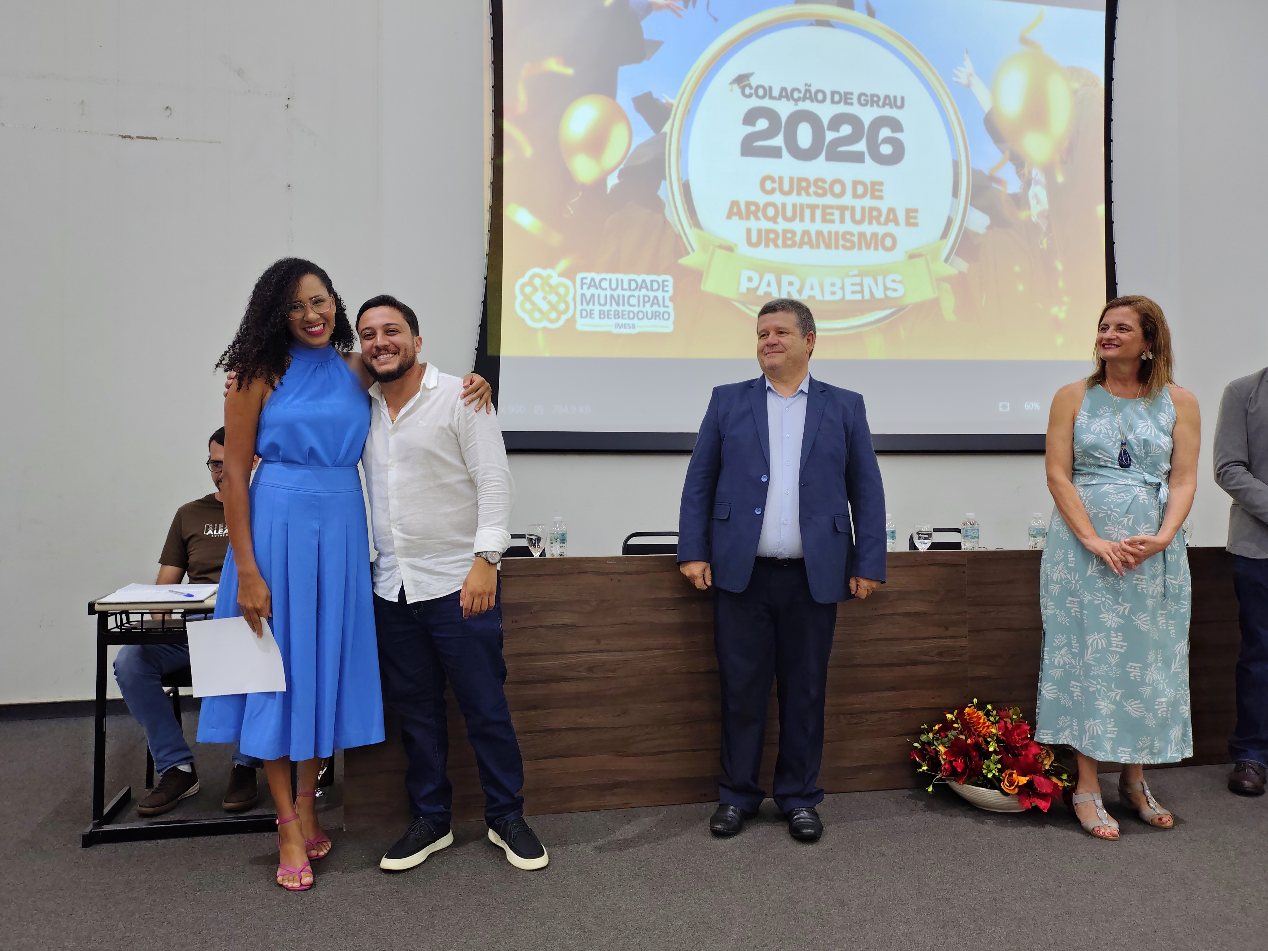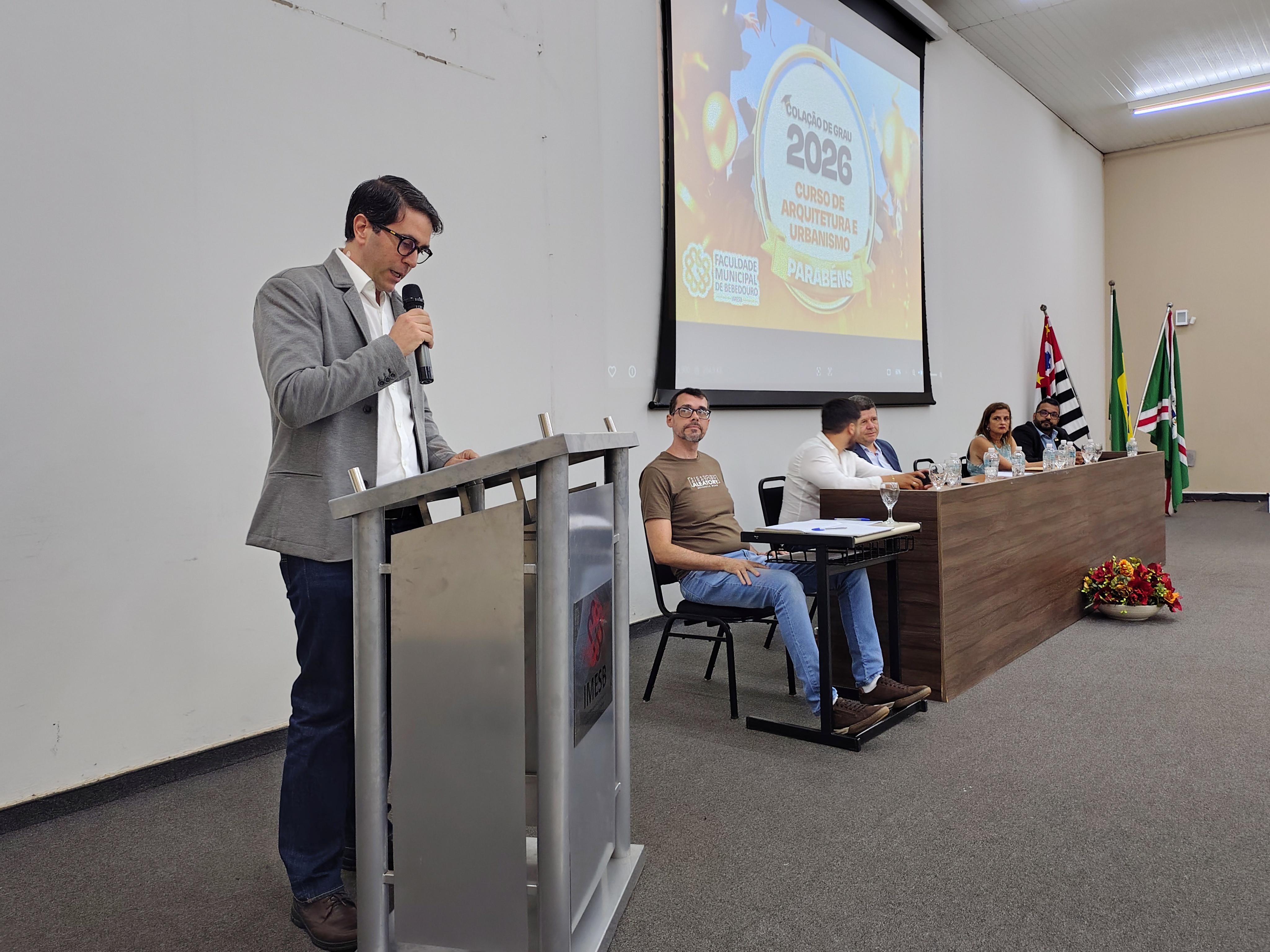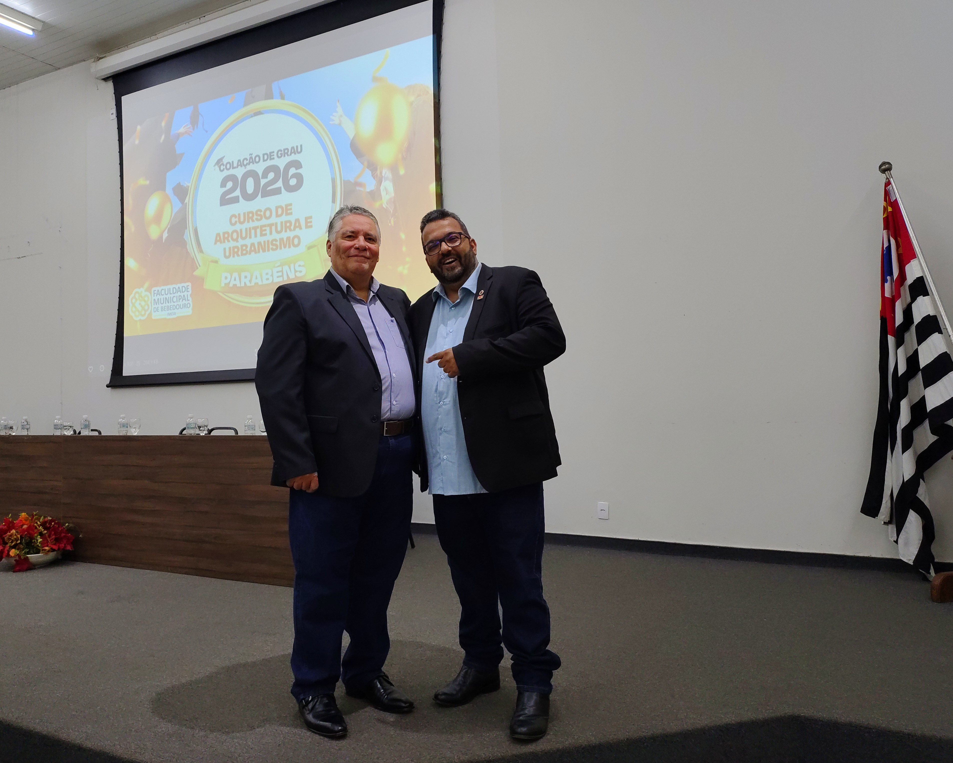 A mesa solene foi composta pelo diretor da Faculdade Municipal, Prof. Me. Luís Antônio Nogueira; pelo coordenador do curso, Prof. Dr. Clóvis Antonio Benedini Lima; pela Profa. Dra. Maria Cristina Pinheiro Machado Sanches; pelo Controlador Geral do Município e professor da instituição, Prof. Me. Marcelo Ramos, representando o prefeito municipal; o vereador Otávio Altobeli Yassine Manzi, representando a Câmara Municipal de Bebedouro; o representante do Rotary Club, Sr. Carlos Augusto de Faria e pelo secretário acadêmico da instituição Luís Fernando Andrade.