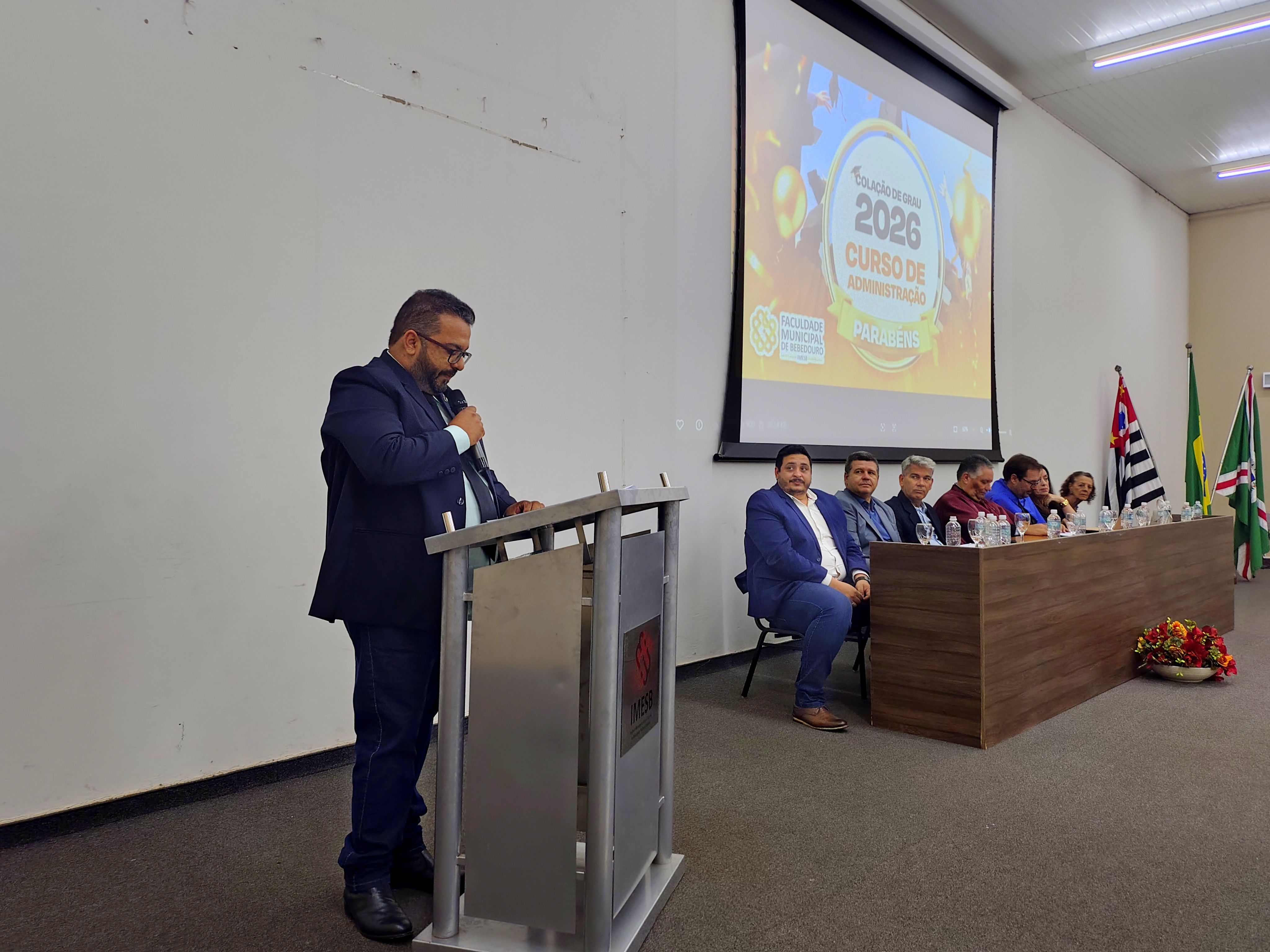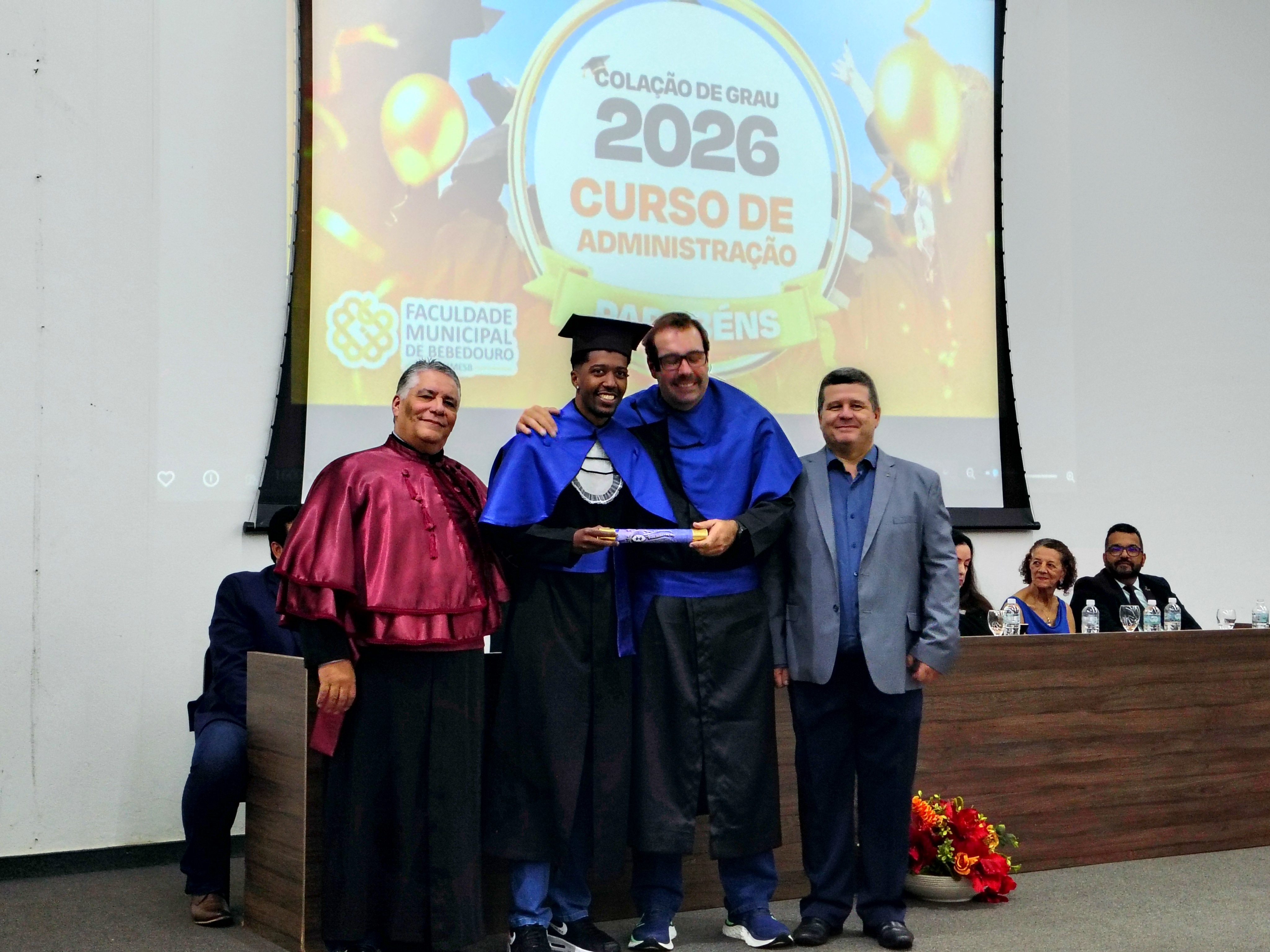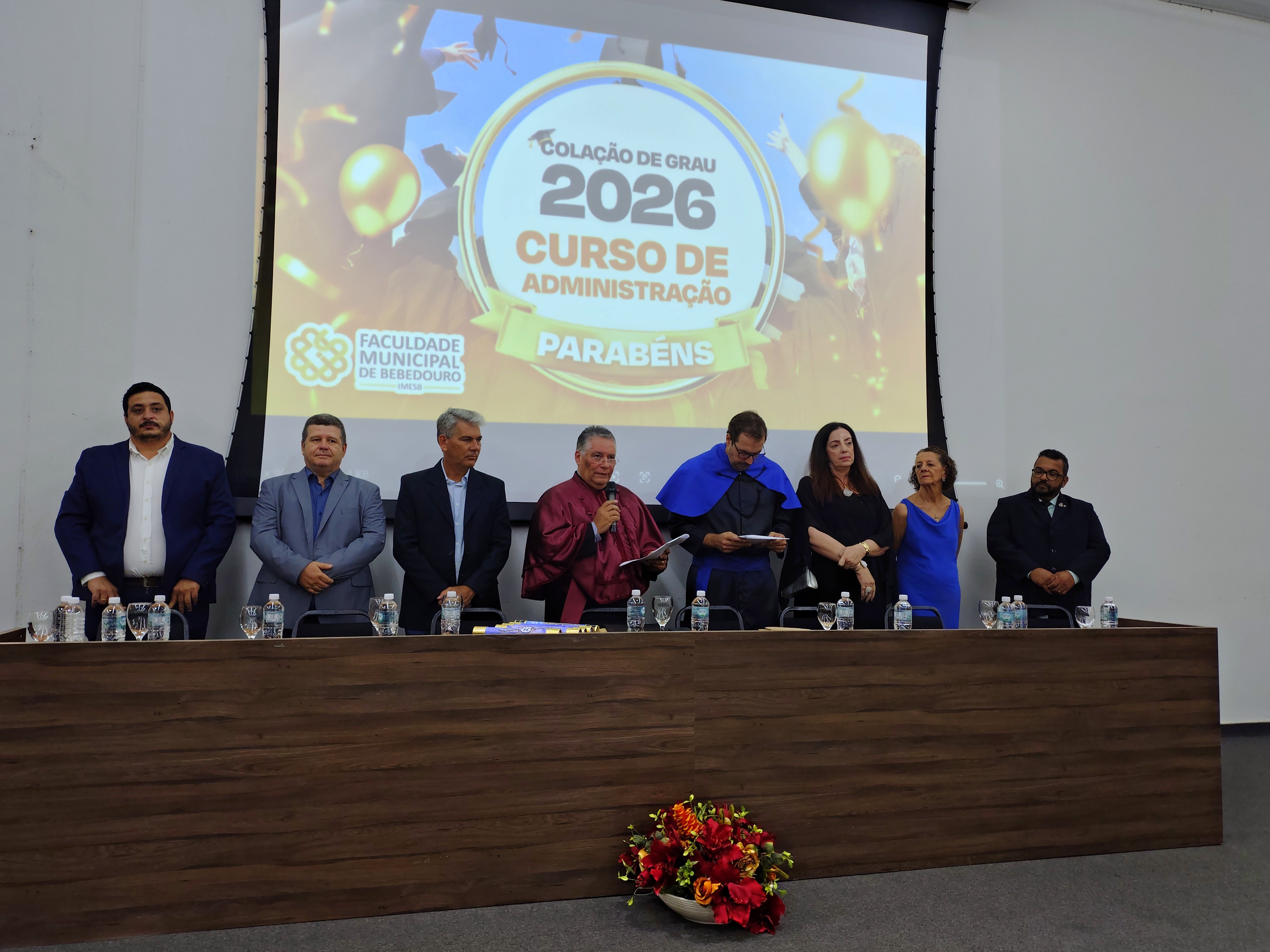 O evento contou com a presença do diretor da Faculdade Municipal e patrono da turma, Me. Luís Antônio Nogueira, do coordenador do Curso de Administração, Dr. Eduardo de Carvalho Machione, do professor Me. Marcelo Ramos, do vice-prefeito Paulo Aurélio Bianchini, do vereador Leo Munhoz, da representante do Conselho Regional de Administração (CRA), Patrícia Izabela Aparecida Somer Gomes, da funcionária homenageada Maria de Fátima Dias e do representante do Rotary Club Bebedouro Solidariedade, Carlos Augusto de Faria, além de familiares, amigos e convidados dos formandos.