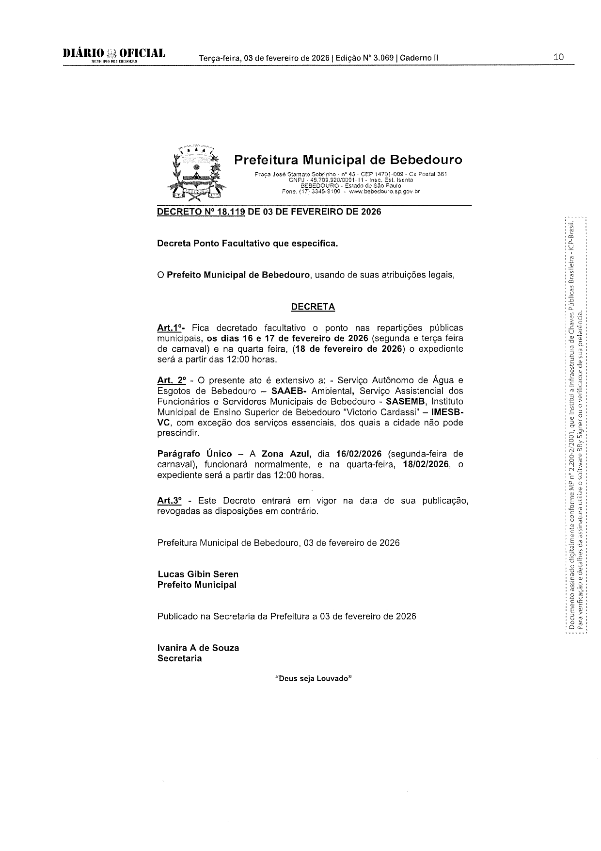 A Faculdade Municipal de Bebedouro informa que, em razão do Carnaval, será ponto facultativo nos dias 16 e 17 de fevereiro de 2026 (segunda e terça-feira).